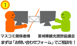 まず、このホームページのお問い合わせフォームから、宮城県の取材に関するご相談をお寄せください。